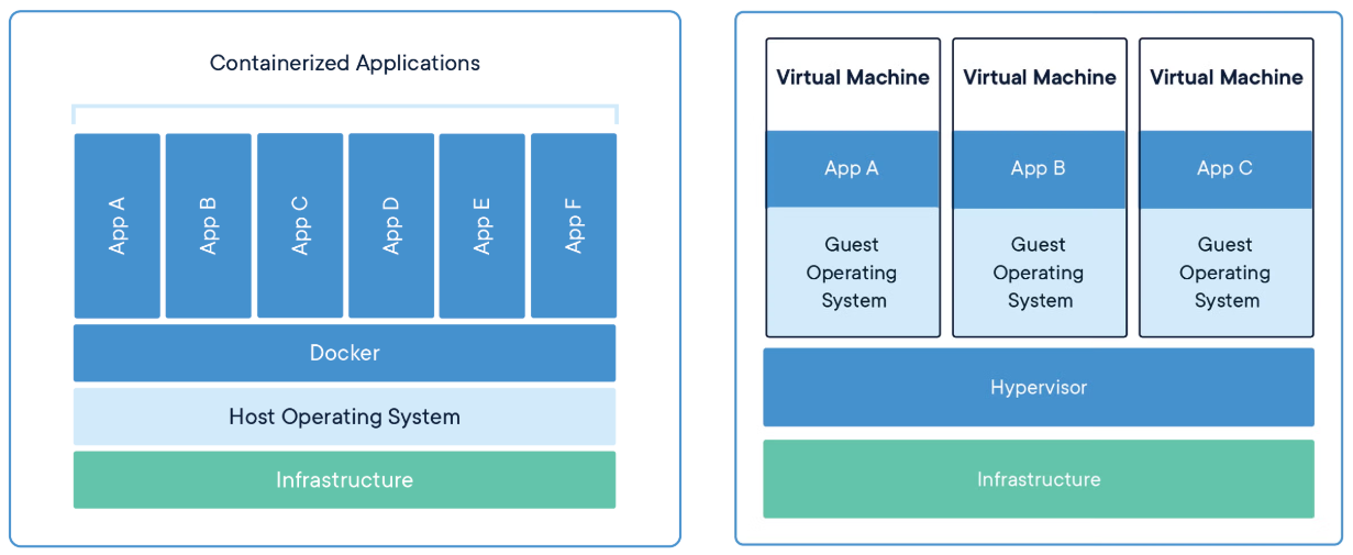 - pomocí Dockeru jsme schopni dosáhnout virtualizace stejně jako s virtuálními stroji (VMs)